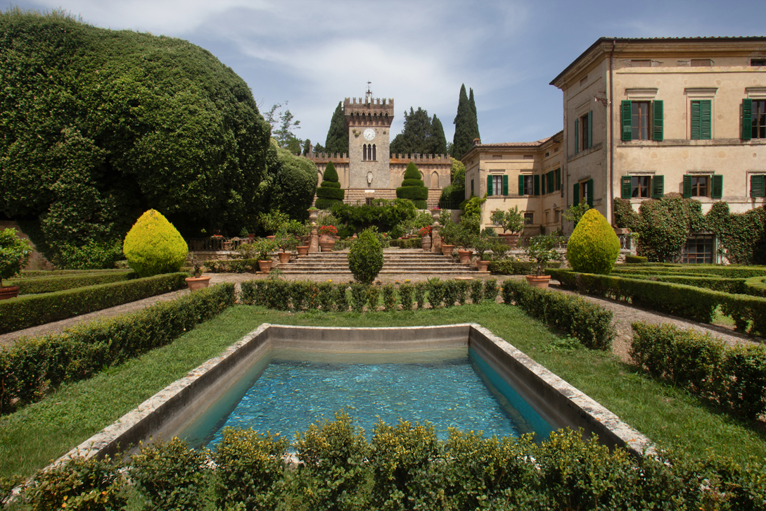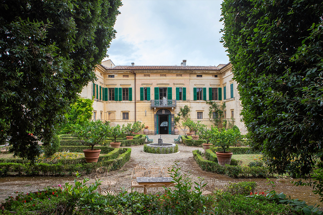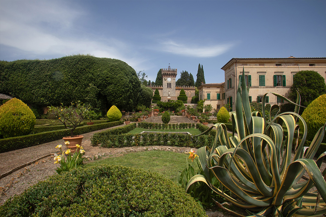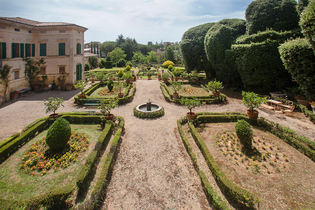 Dal grande e scenografico scalone ornato da 4 statue che porta al piano superiore si accede al giardino a terrazze ricco di conche di limoni e siepi di bosso, sul fondo del quale si affaccia un grande teatro con quinte e palcoscenico formato da lecci disegnato dall’Arch. Fantastici alla fine del’800. Dario Nicodemi scrisse per questo suggestivo teatro all’aperto la commedia “L’alba, il giorno e la notte” che vi fu rappresentata in prima nazionale nel 1920. Il giardino può ospitare fino a 350 persone e allestito per eventi, concerti, feste private e matrimoni.